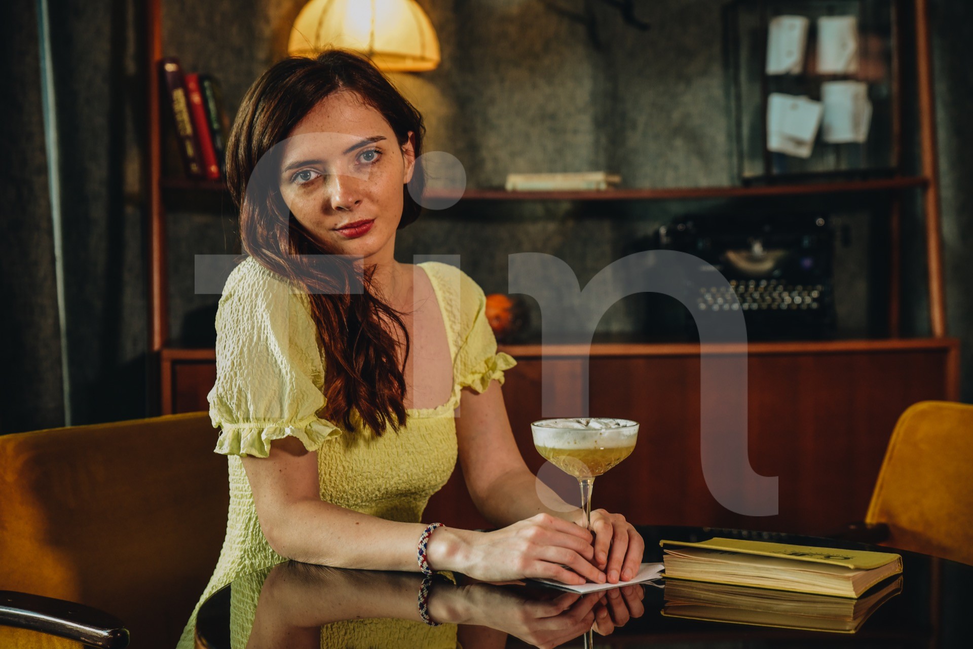 Girl with a cocktail is sitting at a table vintage antique interior